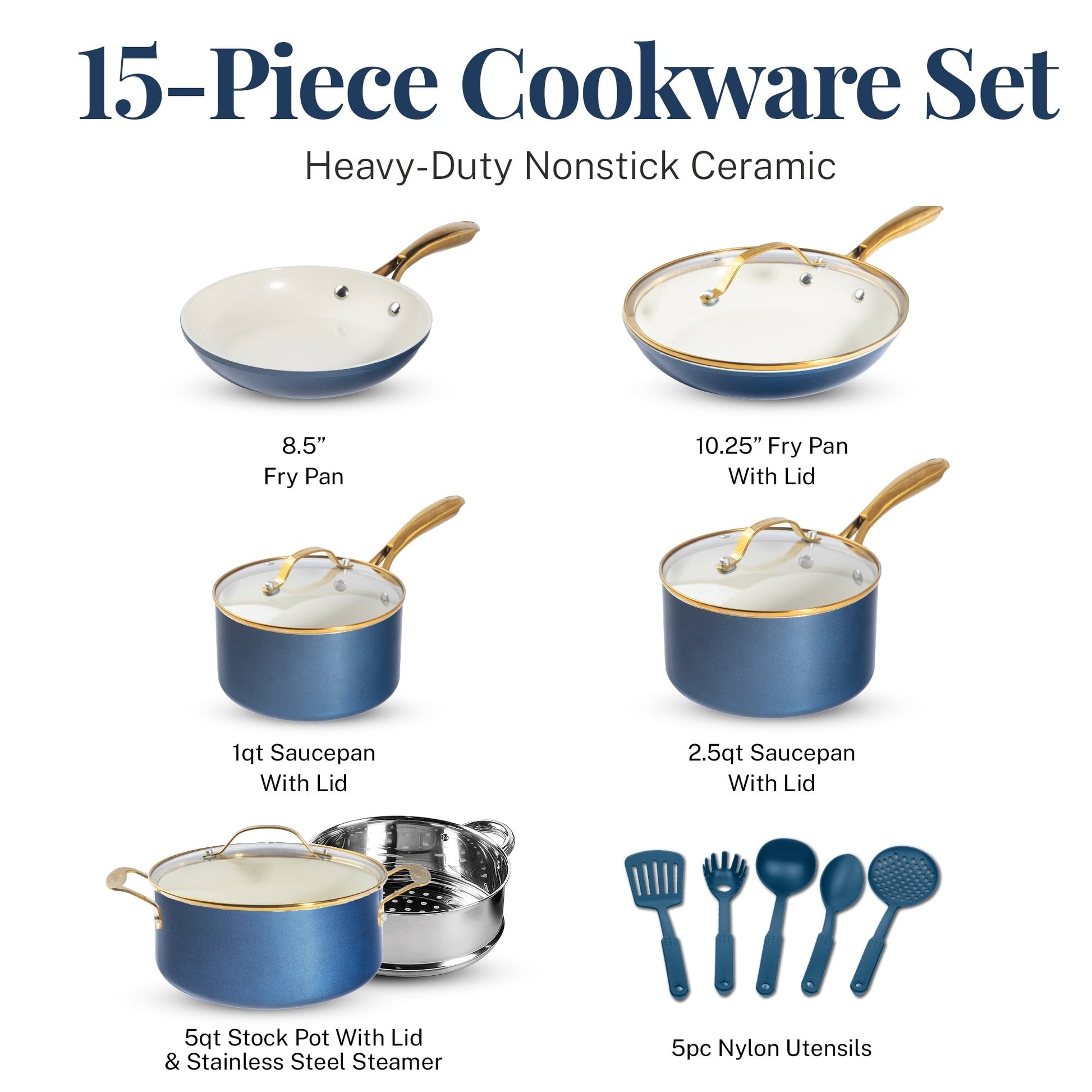 • Ensemble complet de 15 pièces : comprend tous les éléments essentiels : une poêle de 8,5 pi, une poêle à frire de 10,25 po avec couvercle, une casserole de 1,5 pinte avec couvercle, une casserole de 2,5 pintes avec couvercle, une marmite de 5 pintes avec cuiseur vapeur et un ensemble d'ustensiles de 5 pièces, ce qui le rend parfait pour toute tâche de cuisson.