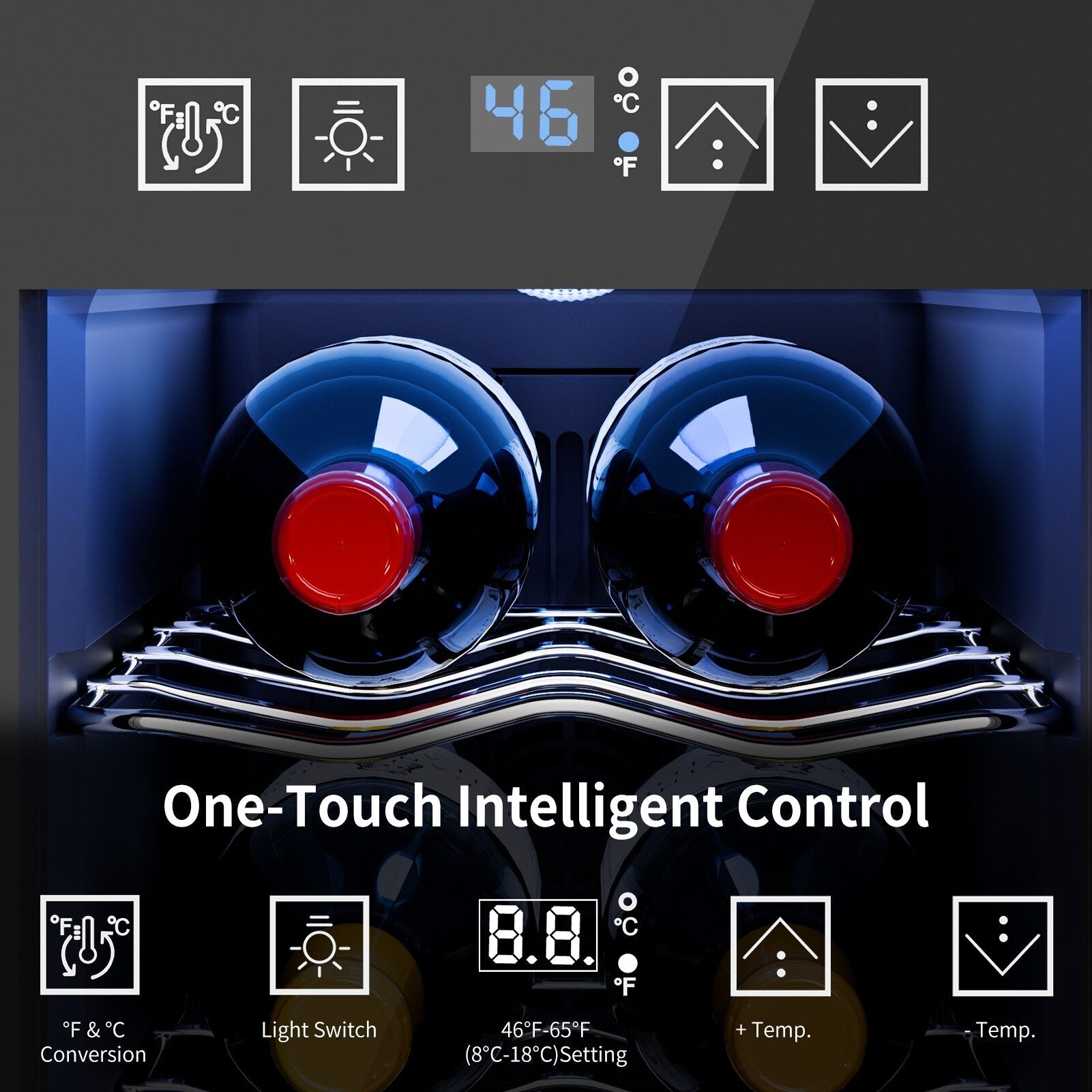Contrôle intelligent par simple pression : L'écran tactile intuitif facilite l'utilisation. Vous pouvez régler la température entre 8 et 18 °C, allumer et éteindre l'éclairage LED et même convertir les températures Fahrenheit en Celsius en quelques clics.