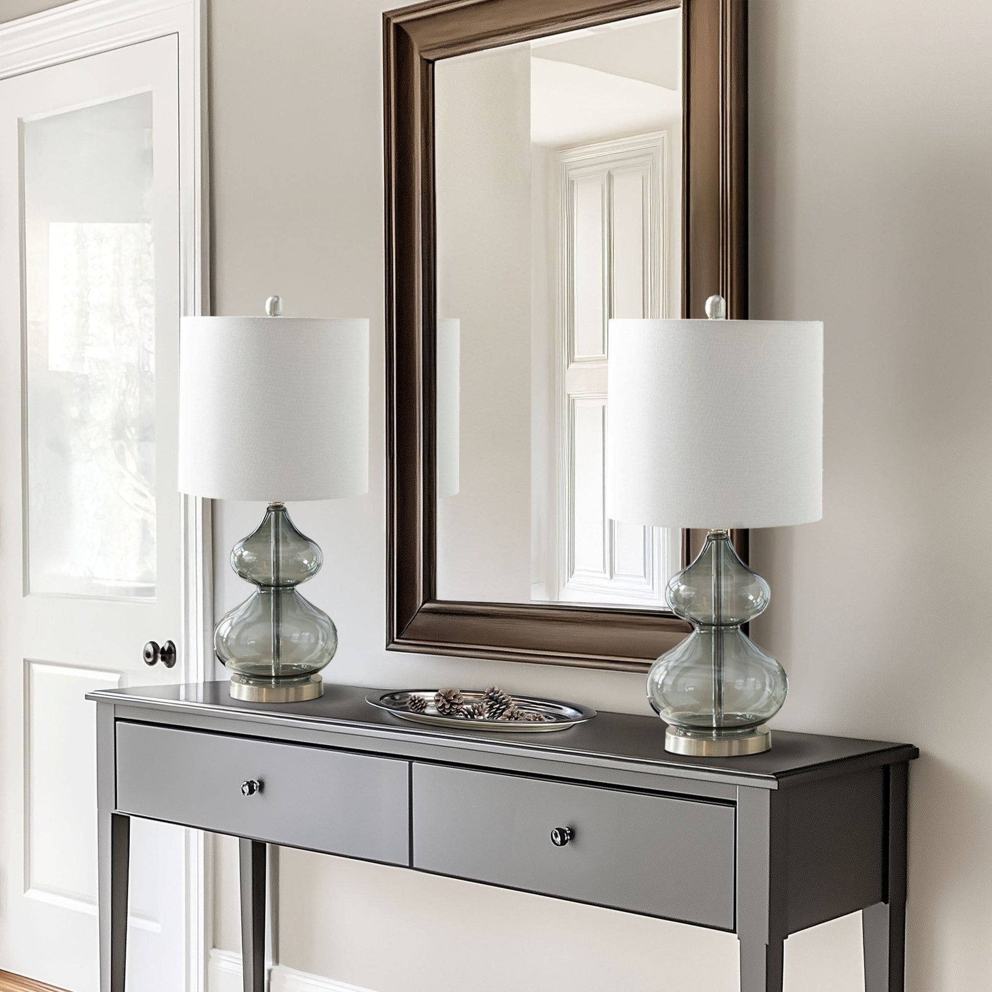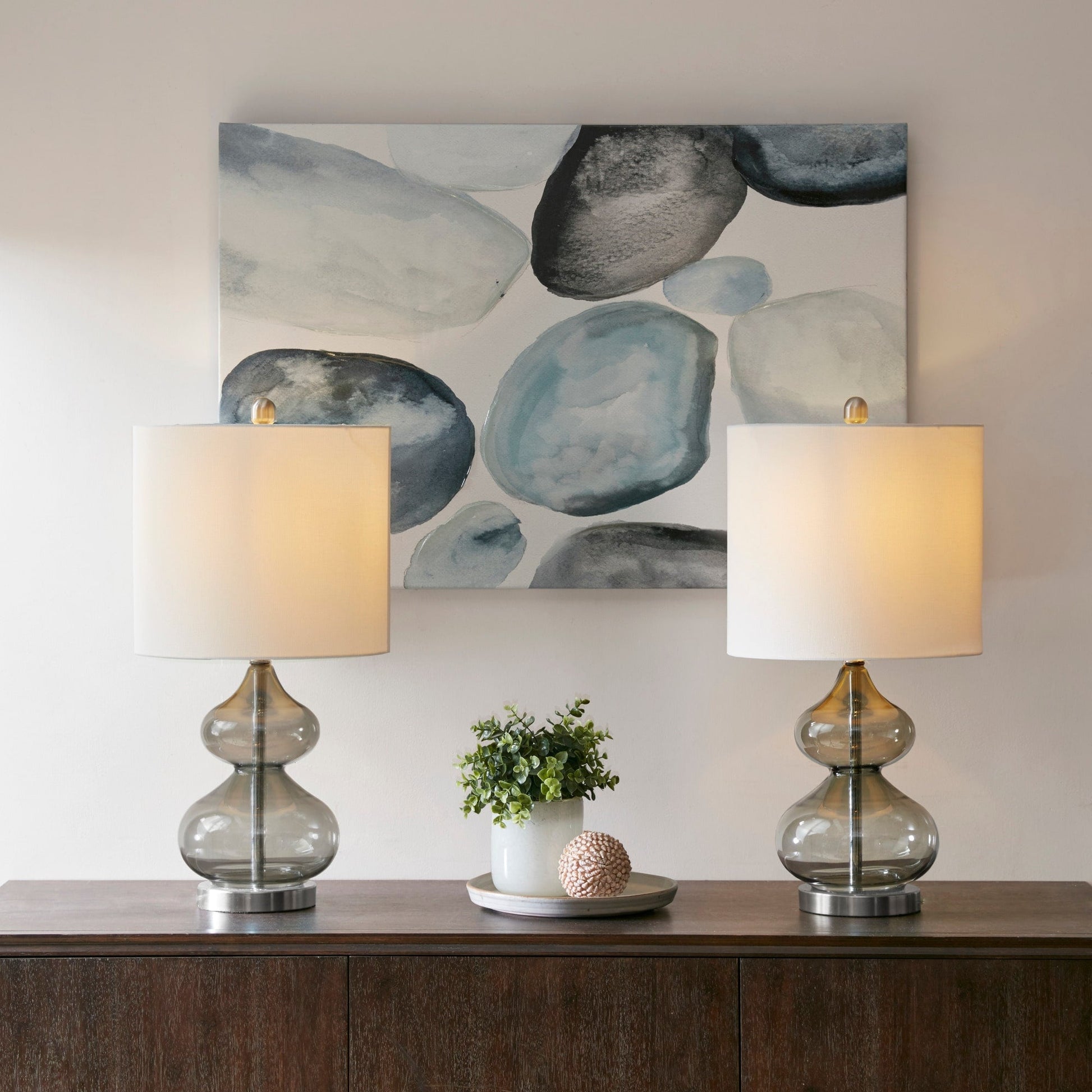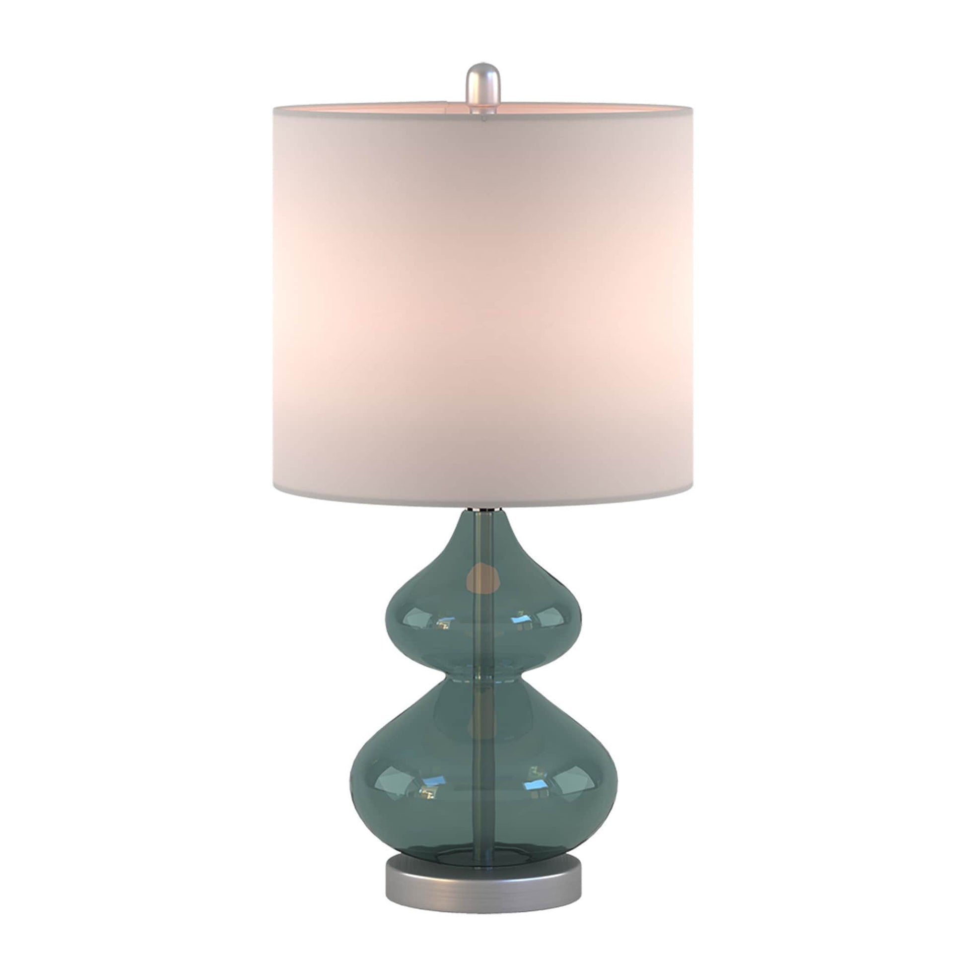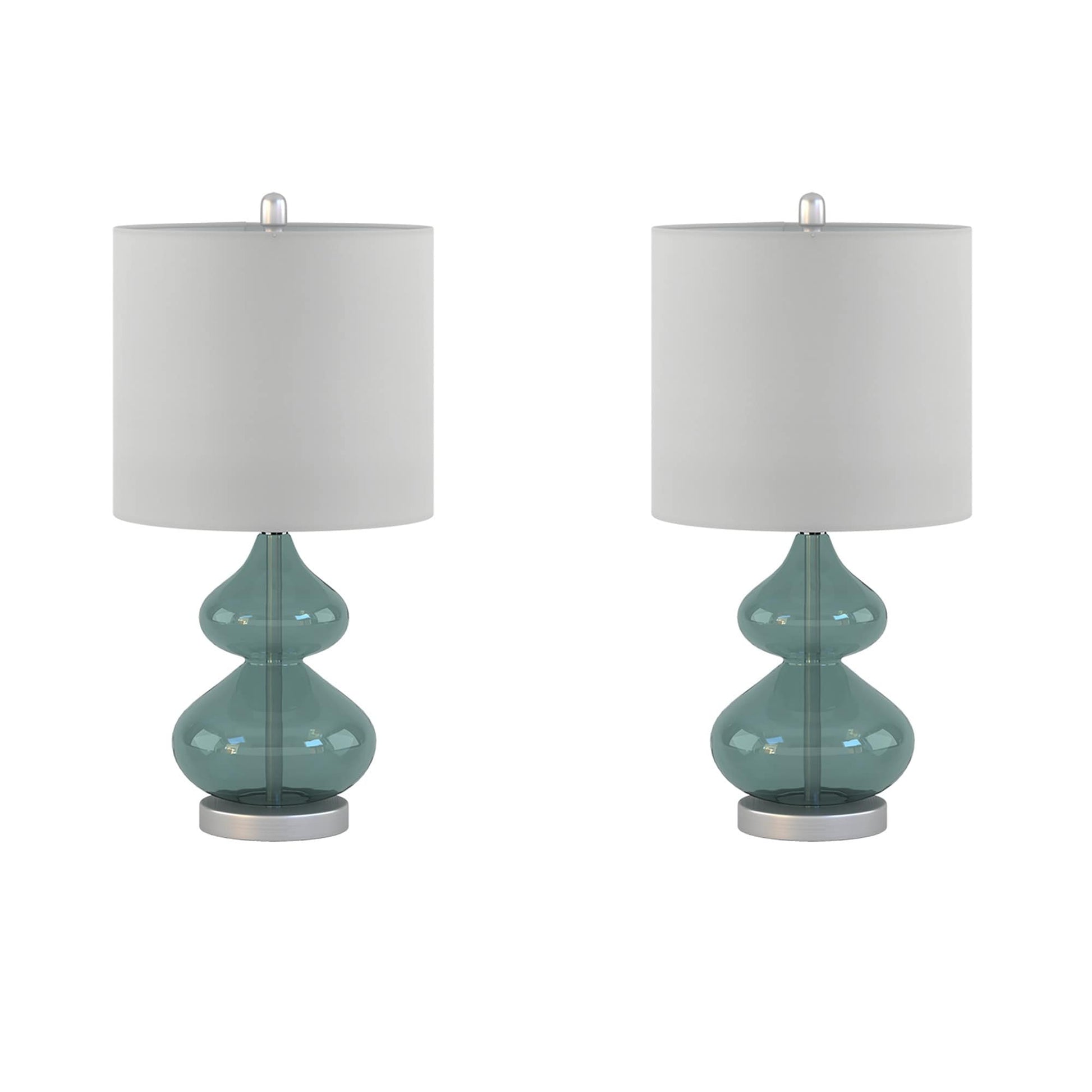 The 510 Design Ellipse Table Lamp Set brings modern elegance to any space. This set of 2 lamps features double-stacked gourd-shaped glass bases with polished surfaces and brushed gold metal accents. The translucent glass softly diffuses light for a warm, ambient glow. Each lamp is topped with a white fabric drum shade and a gold metal finial for a sophisticated touch. Designed for versatility, they provide both upward and downward lighting and include two energy-efficient 9W LED bulbs. Perfect for living rooms, bedrooms, or home offices. Spot clean only. Includes a 2-year limited warranty.