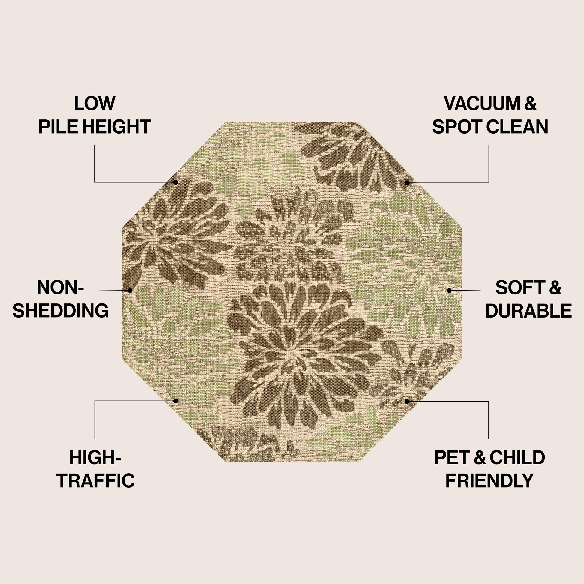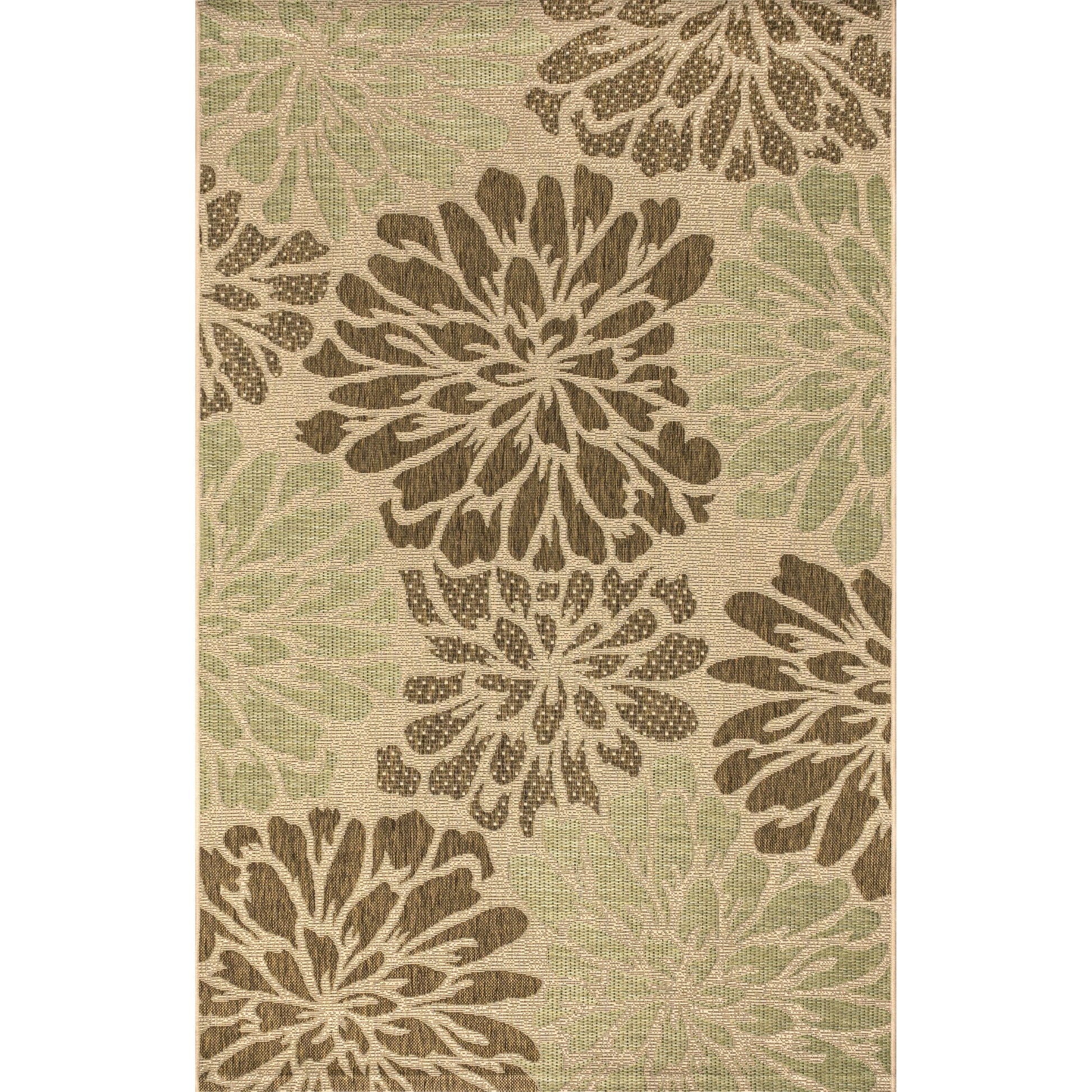 Elevate your indoor or outdoor space with our Marvao Modern Floral Textured Weave Area Rug. The sage green, brown, and beige color palette beautifully complements the large-scale geometric floral pattern, adding a graphic punch to any room or patio. Made with 100% polypropylene, this flatweave rug is water-resistant and durable enough for high-traffic areas indoors or out.