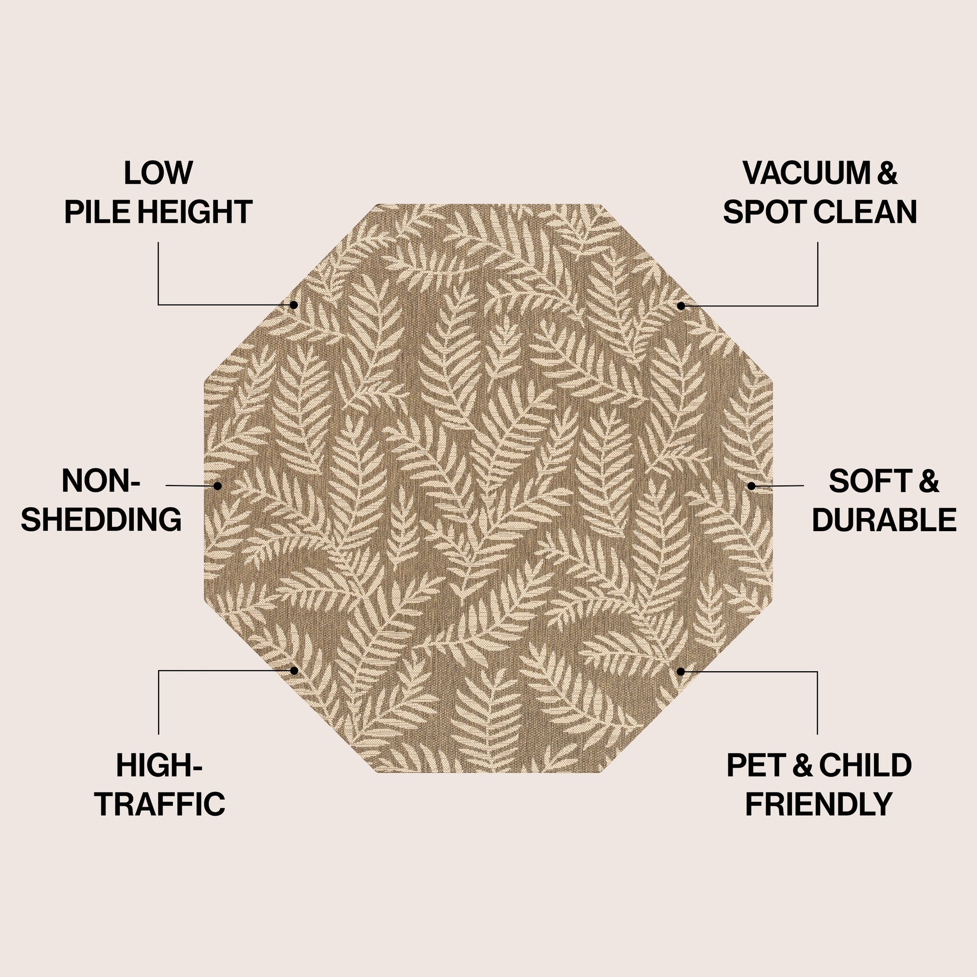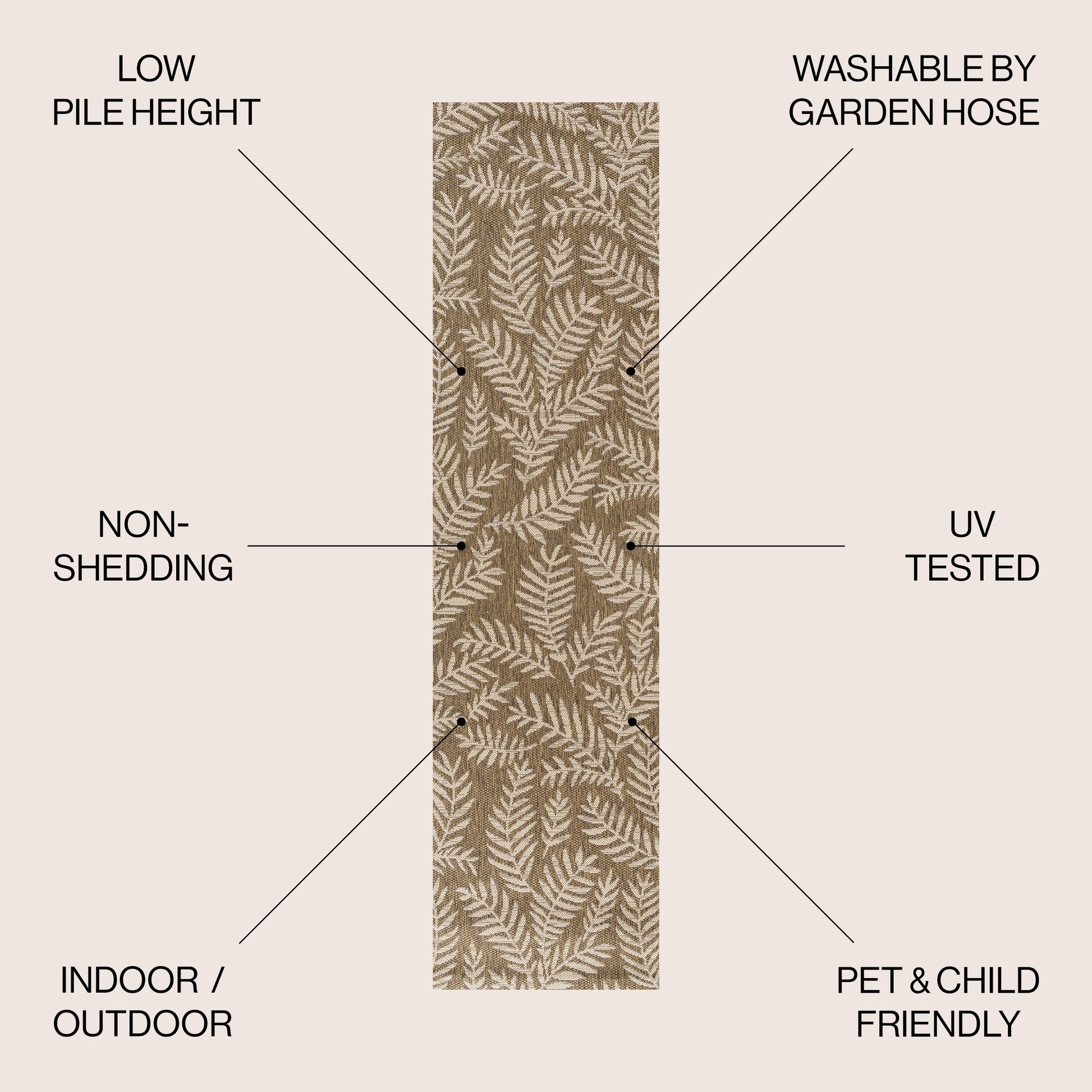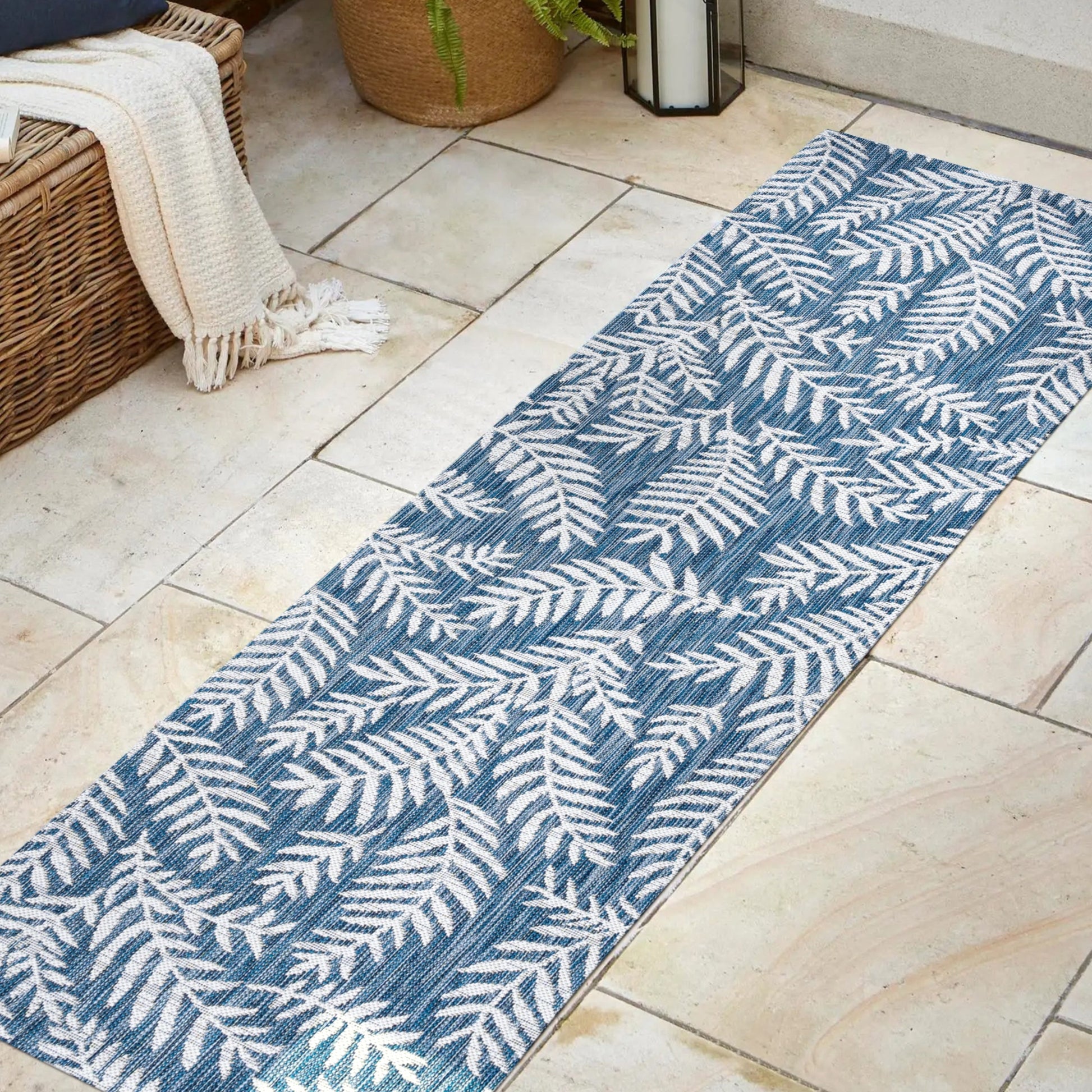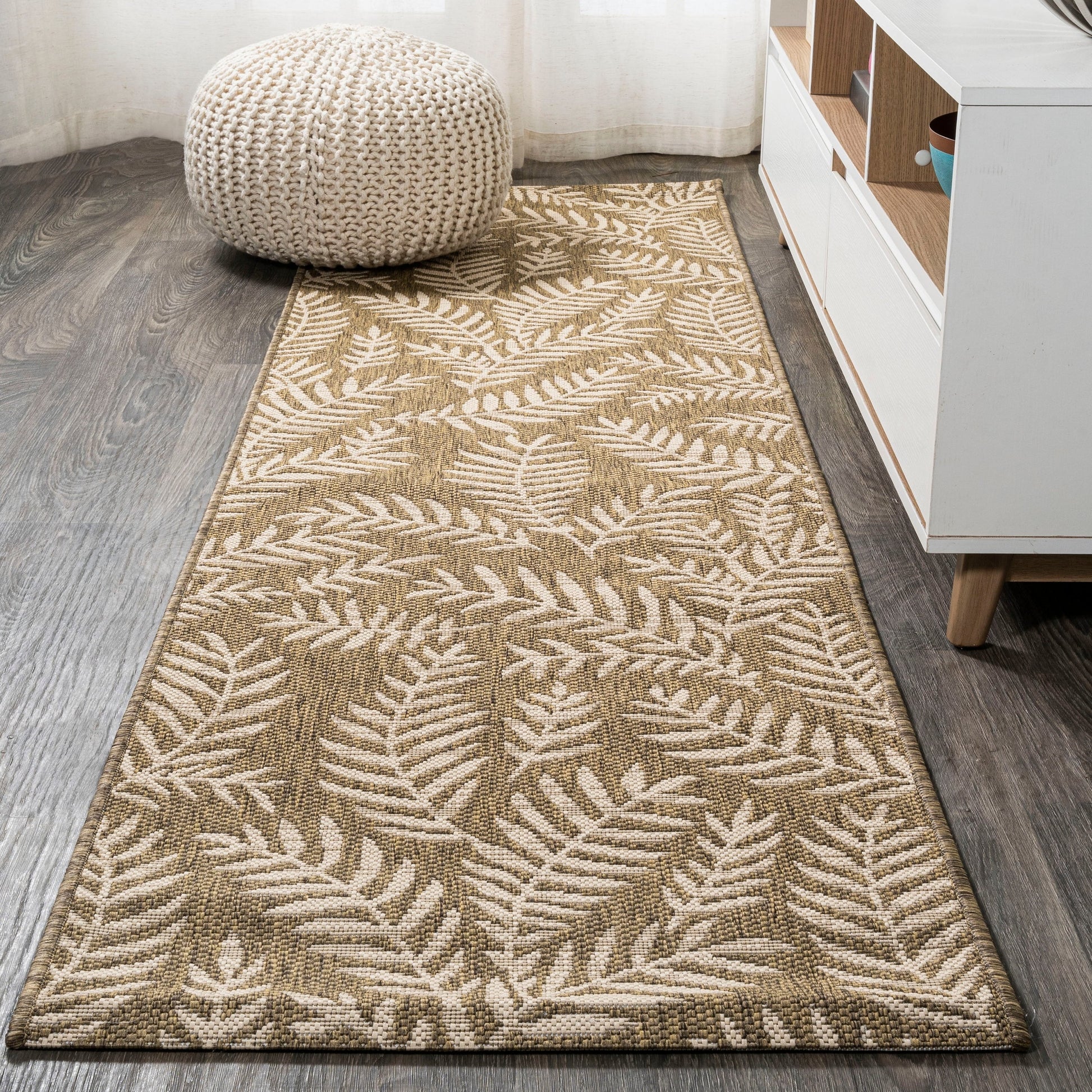 Bring a touch of the tropics to your indoor or outdoor space with the Galon Palm Frond Area Rug by JONATHAN Y. The allover palm frond pattern features scattered palm branches in contrasting colors, creating a busy yet stylish design. Ideal for your tropical patio, entryway, kitchen, hallway, living room or bedroom, this rug's flatweave construction is made of 100% durable and easy-care polypropylene. Kid-proof and pet-friendly, simply sweep or hose it down with mild soap and water. Available in multiple sizes and colors, this rug is power-loomed in Turkey and has a thickness of 0.19 inches.