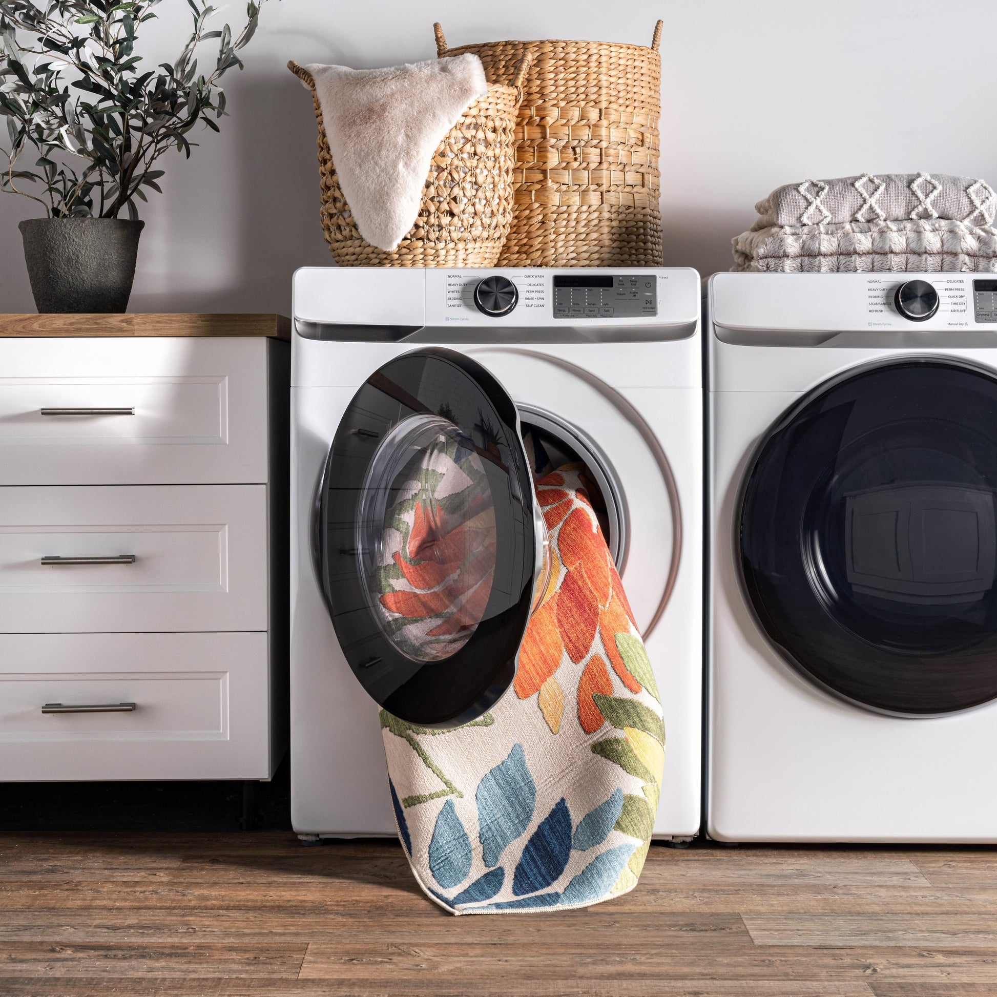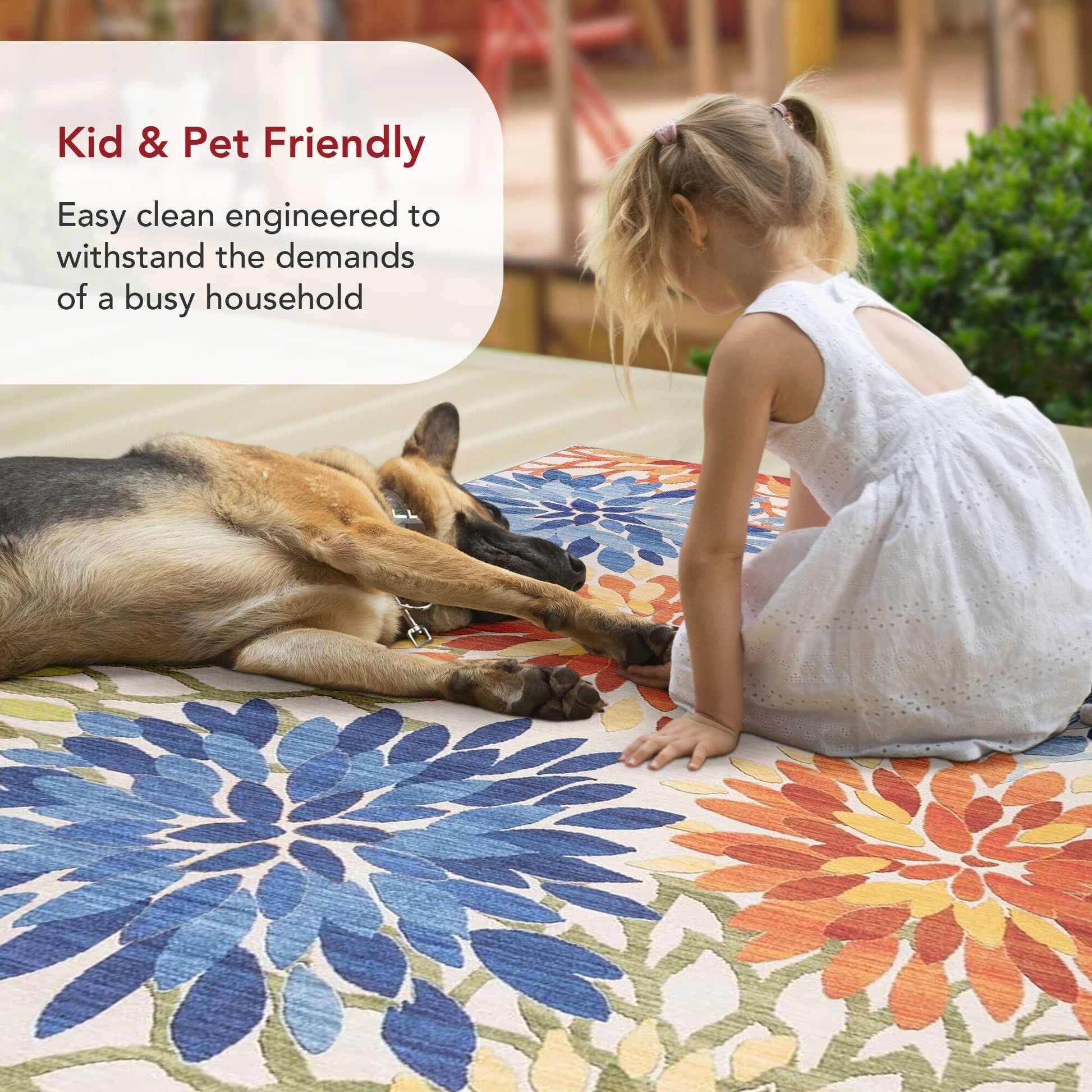 Add a pop of color with this indoor/outdoor floral machine washable area rug. Made from sustainably-sourced, premium recycled synthetic fibers, this washable area rug is made to withstand regular foot traffic. Our machine-washable collection is functional and stylish to keep up with your busy lifestyle. Simply roll your rug up, throw it in the washing machine, and you're done! Elevate your space with our pet-friendly and easy to clean area rugs.